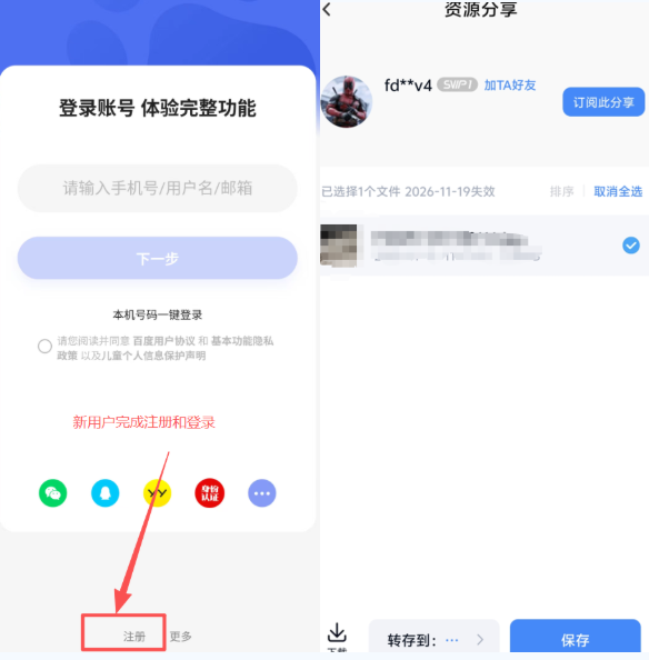 用户需完成百度APP的下载注册和登录,并搜索复制手机百度专属口令,端内会跳转百度网盘资源页。