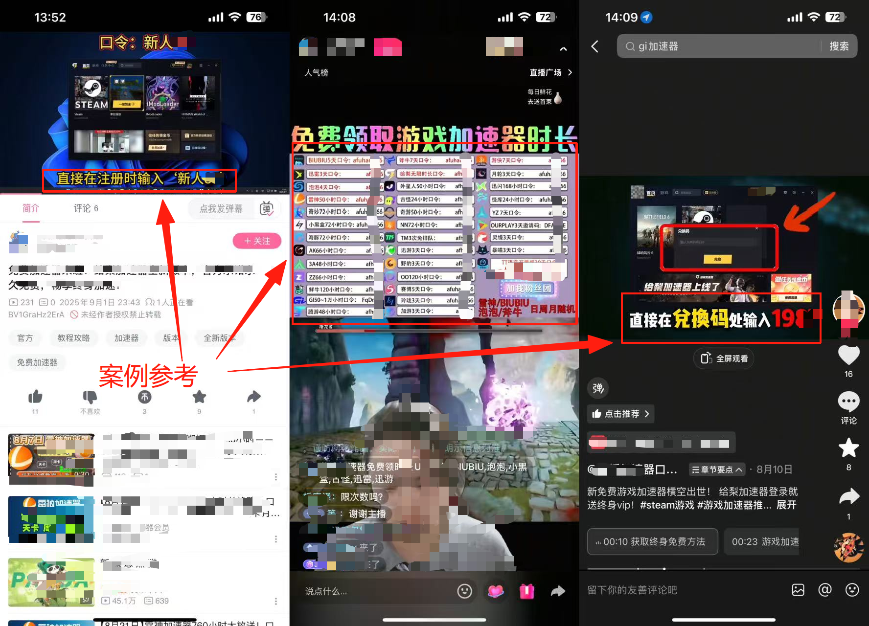 或者通过游戏玩家粉丝社群/直播/公众号/工具类网站/贴吧/微博/等进行推广分享【加速器会员兑换口令】,主打免费分享福利;