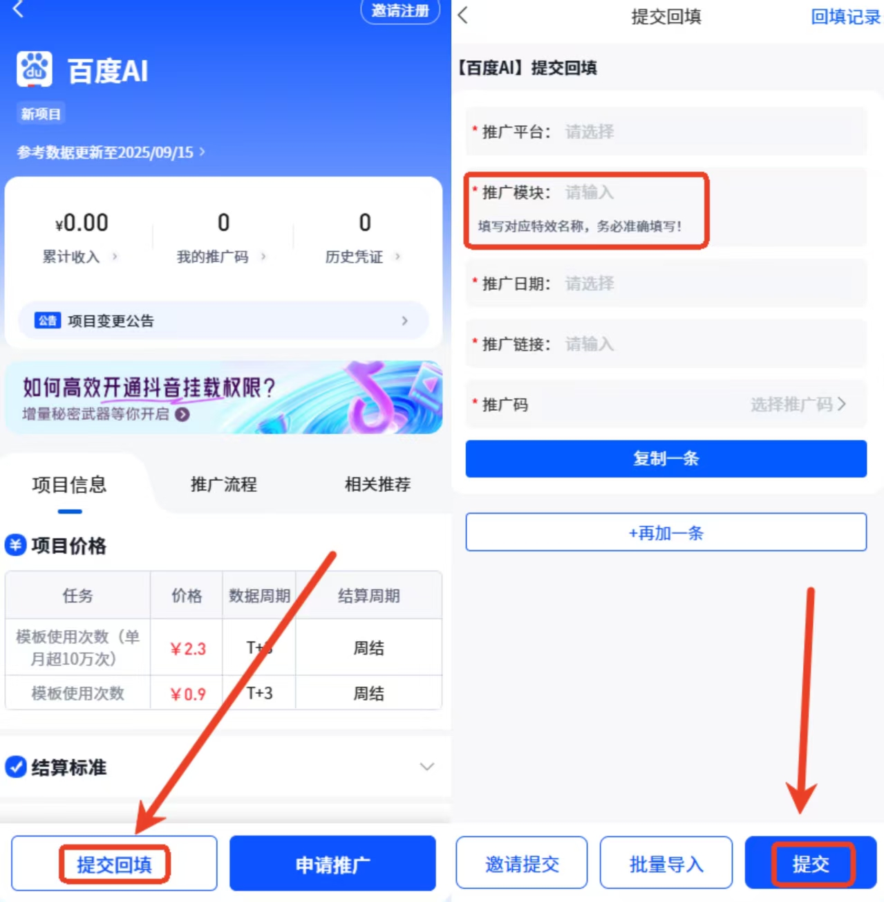 第一步1.推广完成后点击提交回填,填写相关信息。