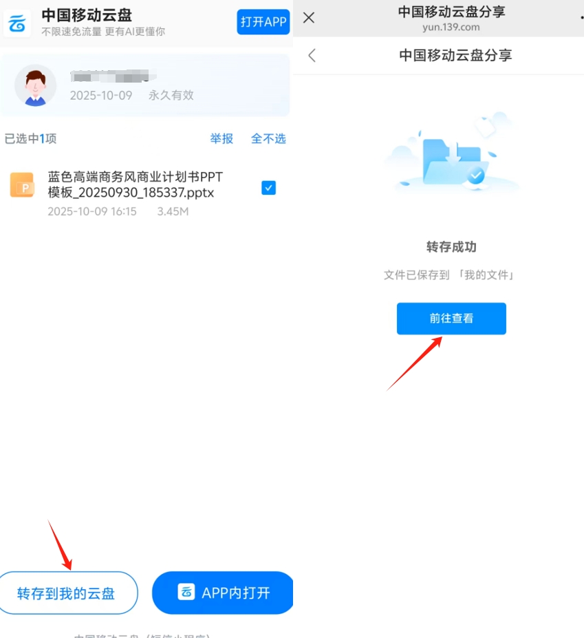 拉新逻辑:新用户点开链接,将资源“保存到网盘”,然后系统提示注册+下载APP,下载完成之后,点击“打开移动云盘APP查看”看一会分享的资源。