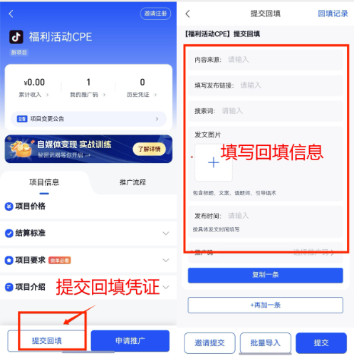 第三步发布后需每天在任推邦平台点击【提交回填】回填推广凭证,笔记需留存一个月→等待打款。
