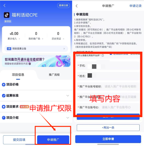 第一步在任推邦点击申请推广,填写报备信息,审核通过后获取【推广关键词】。(账号有一定粉丝量级的达人优先通过)