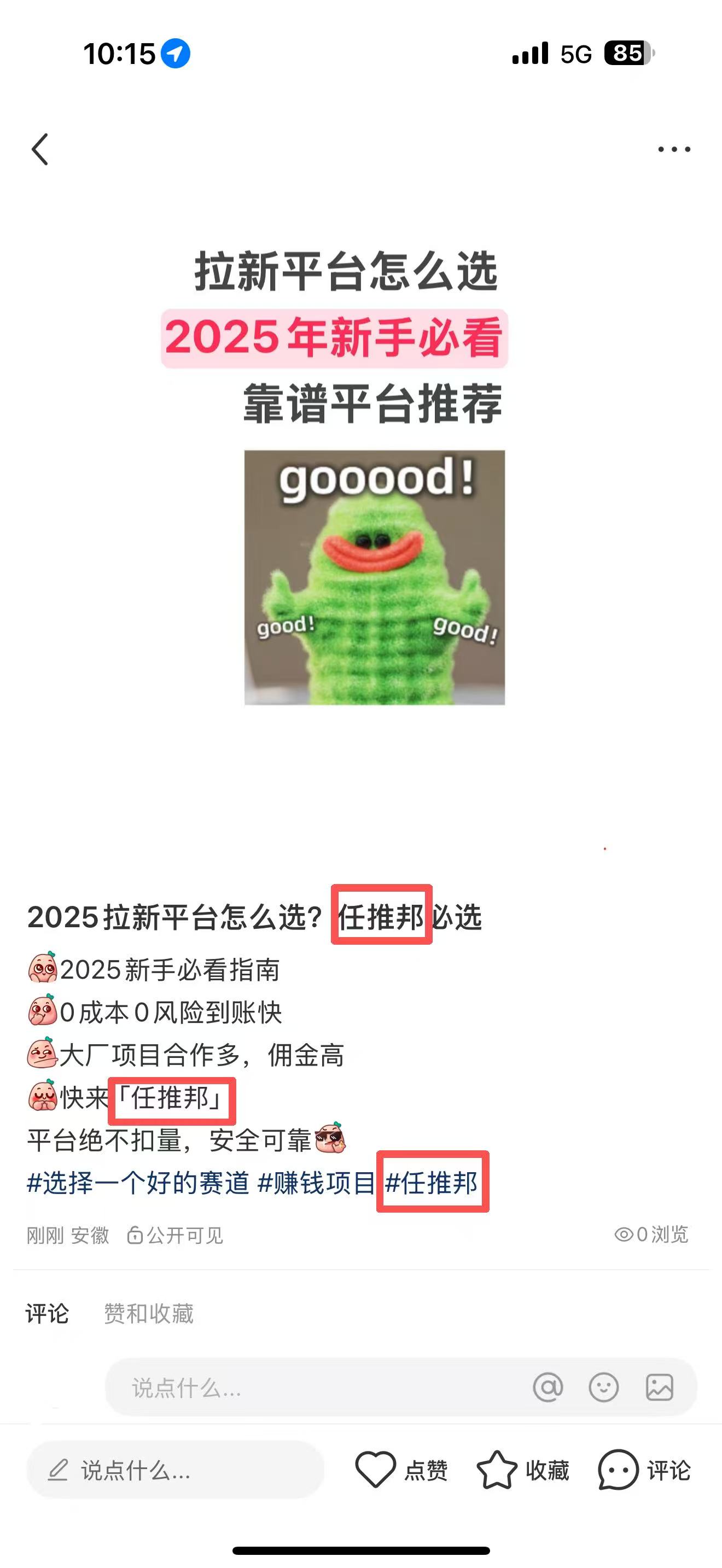 3、视频/图文内容、评论区、标题、文案等至少四选2处去推荐任推邦。