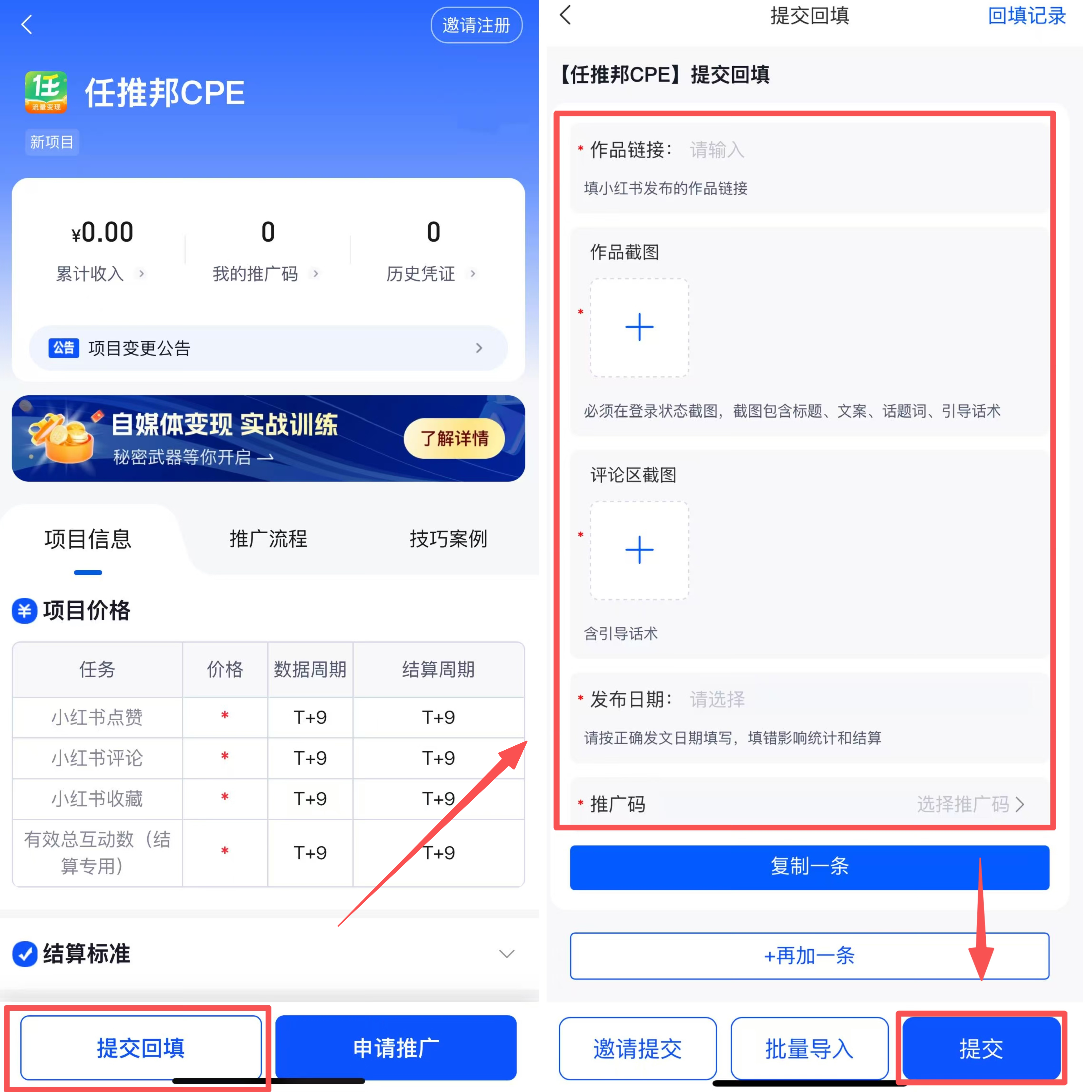发文成功后,在任推邦平台找到“任推邦CPE”,点击提交回填,并按照要求填写相关内容。