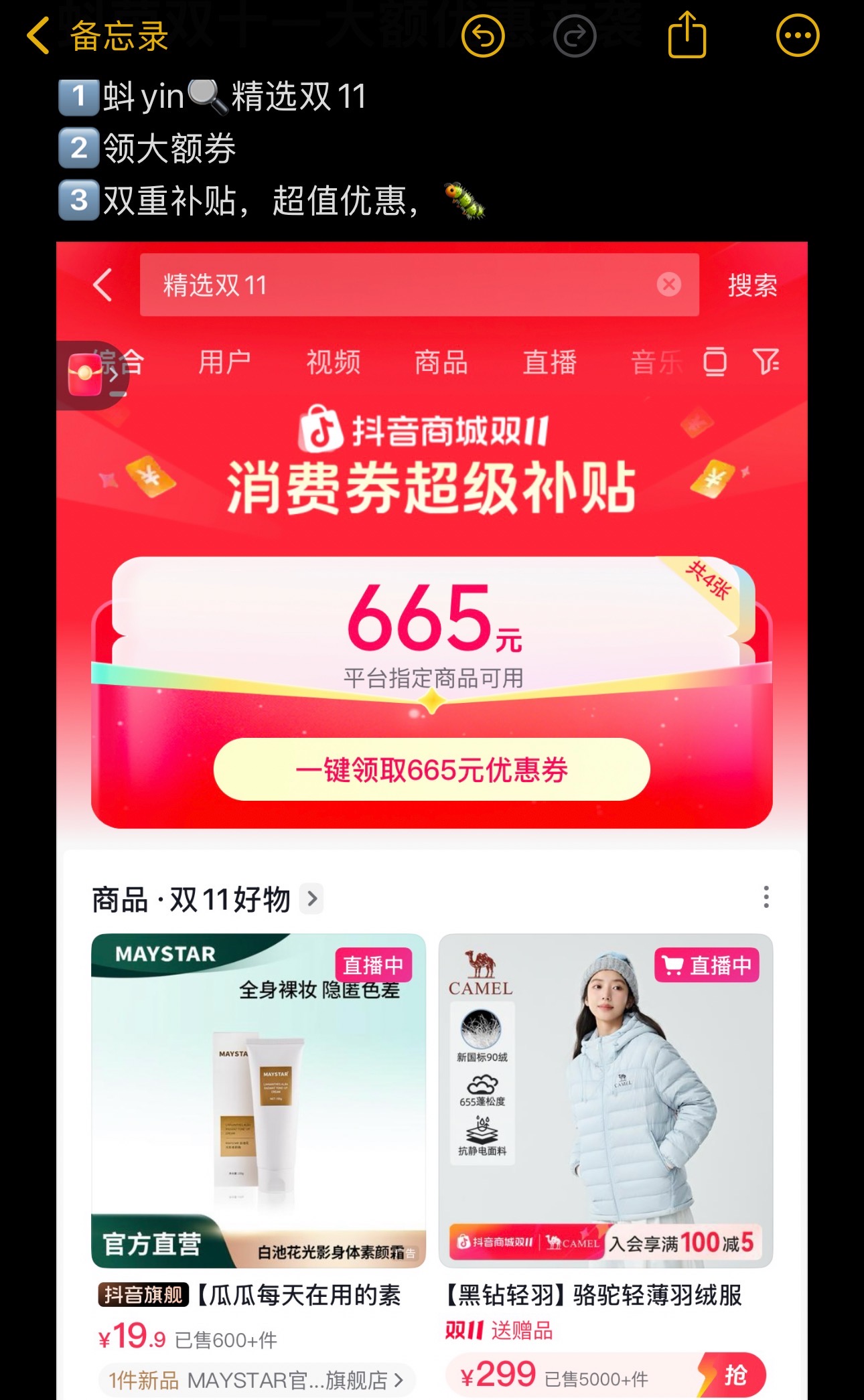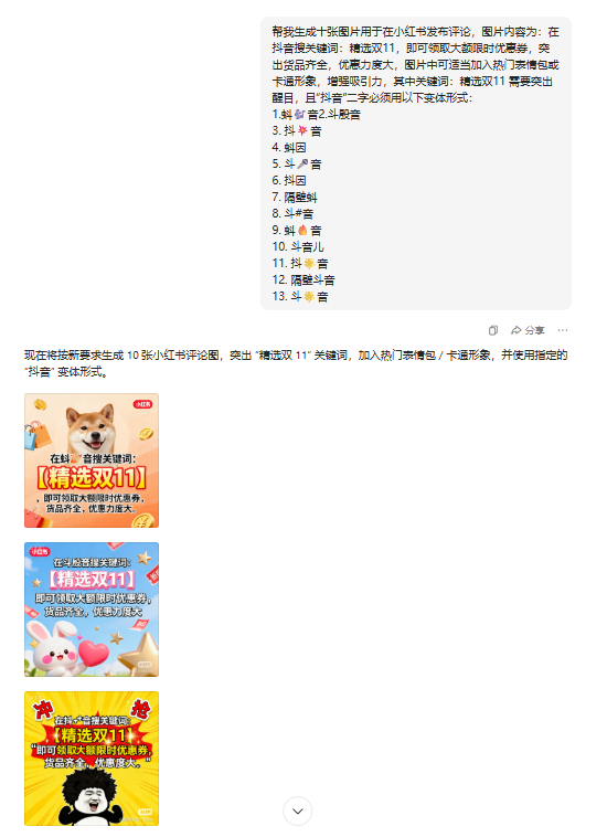 话术:帮我生成十张图片用于在小红书发布评论,图片内容为:在抖音搜关键词:精选双11,即可领取大额限时优惠券,突出货品齐全,优惠力度大,图片中可适当加入热门表情包或卡通形象,增强吸引力,其中“抖音”二字必须用以下变体形式: 1.蚪音2.斗殷音3. 抖音 4. 蚪因 5. 斗音 6. 抖因 7. 隔壁蚪 8. 斗#音 9. 蚪音 10. 斗音儿 11. 抖音 12. 隔壁斗音 13. 斗音