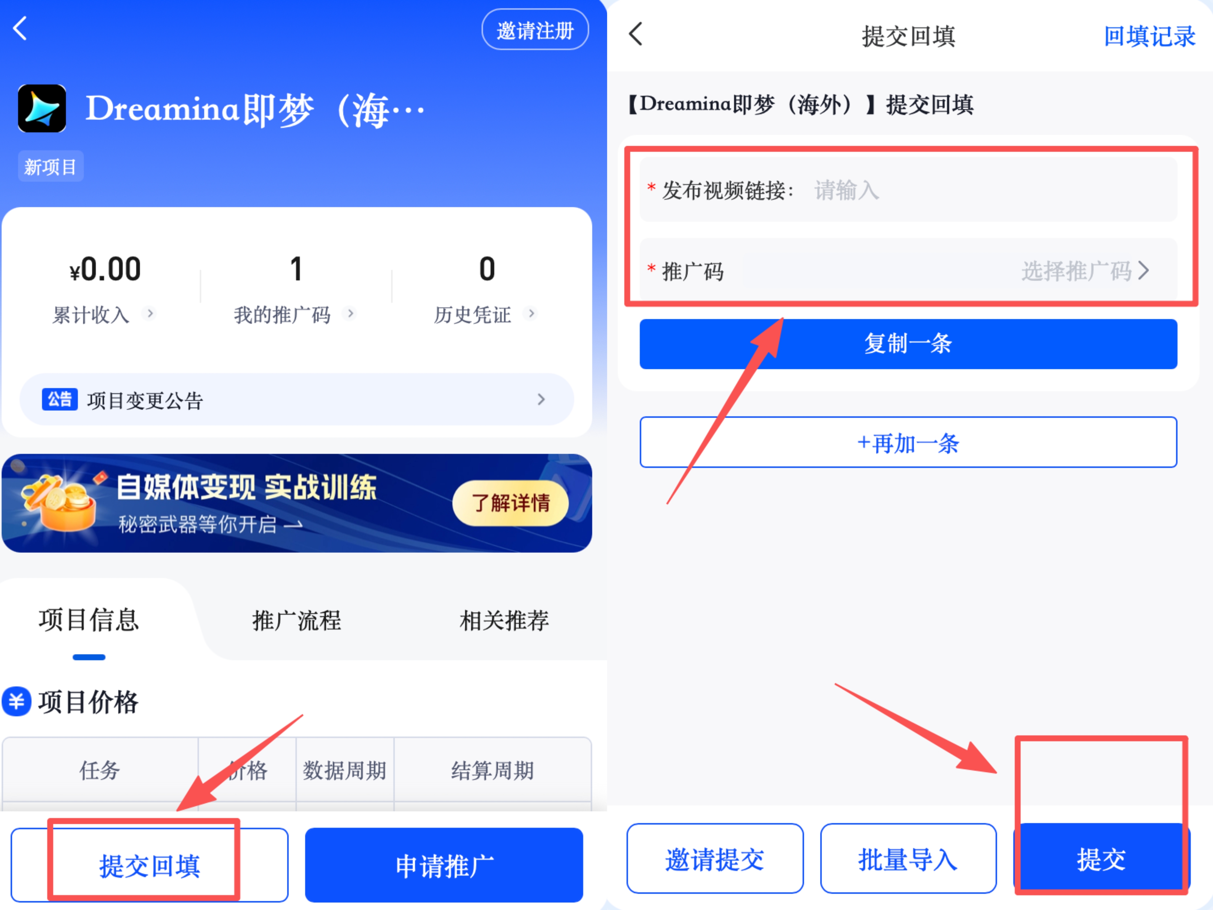发布完成之后请立刻回填!(注意!回填之后状态只会显示审核中和审核不通过,审核不通过需要检查提交链接是否有误,重新提交回填!)