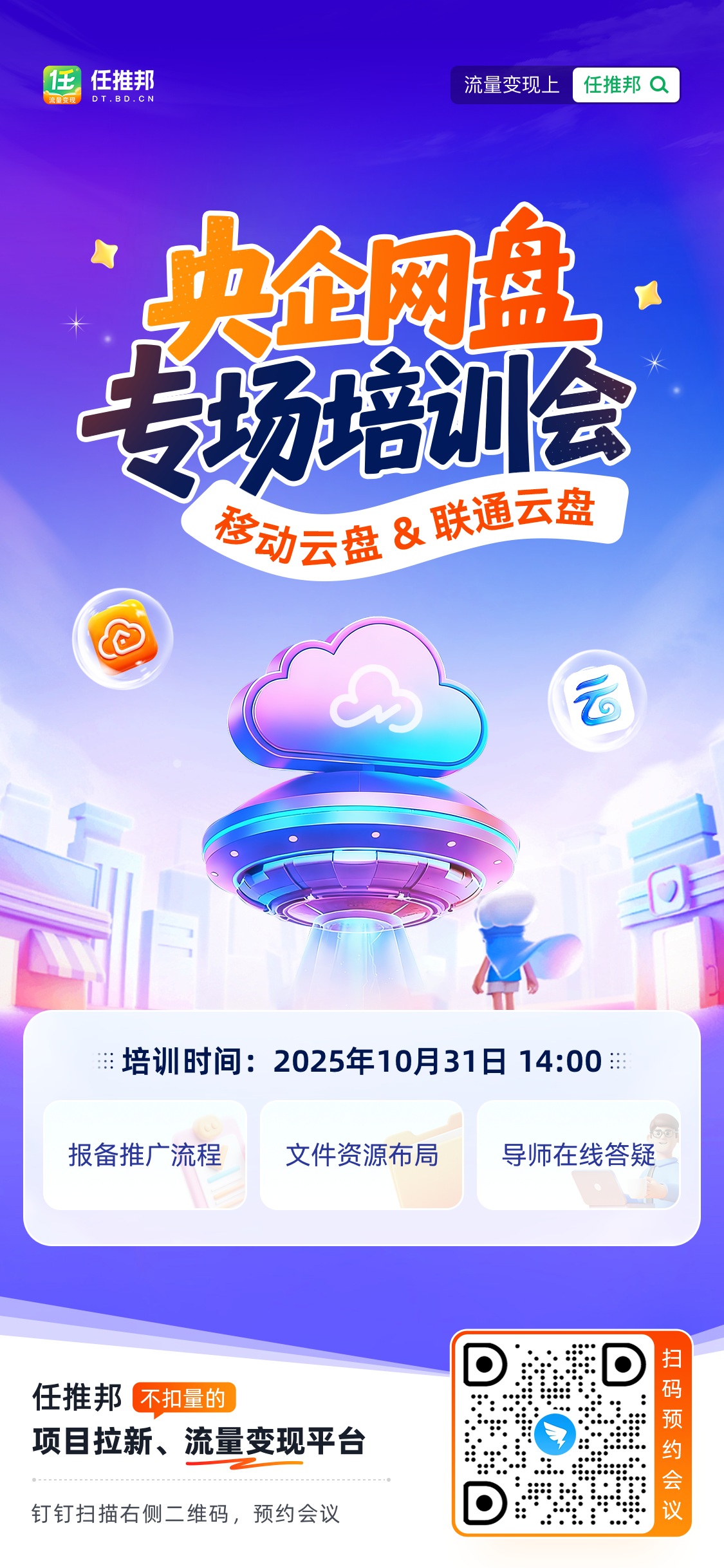 任推邦-央企网盘专场培训会:移动云盘&联通云盘!(扫描下方二维码报名)