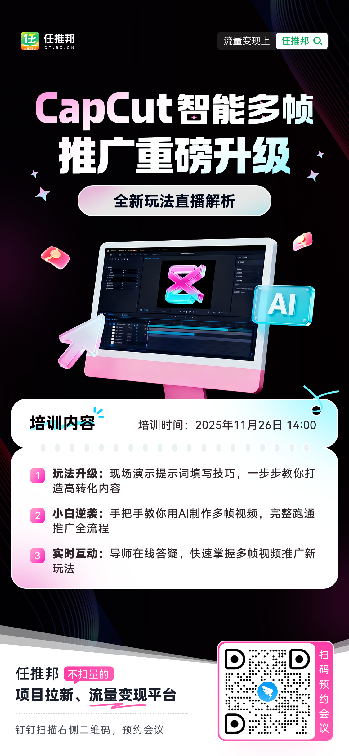 任推邦-Capcut智能多帧推广重磅升级,全新玩法直播解析(扫描下方二维码报名)