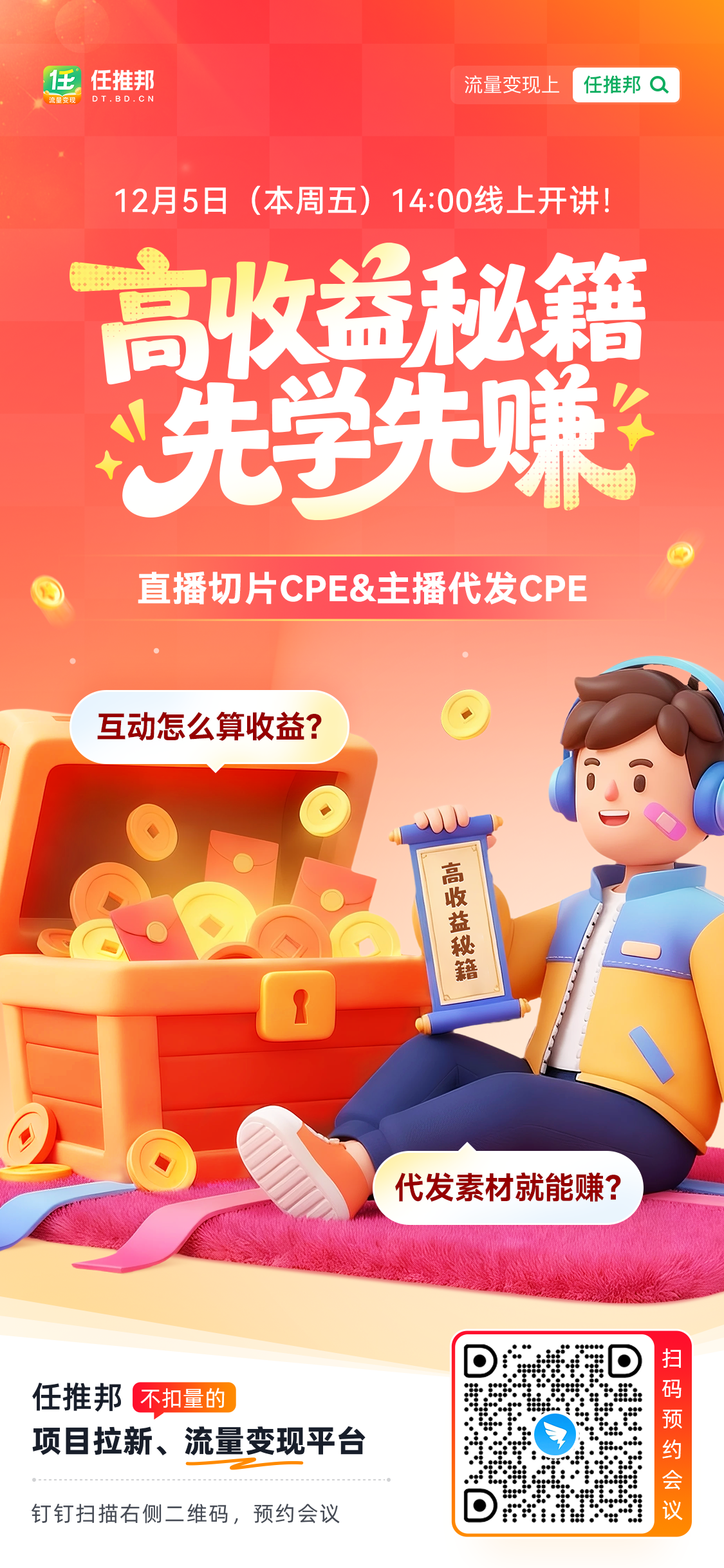 任推邦-高收益秘籍先学先赚:直播切片CPE&主播代发CPE(扫描下方二维码报名)