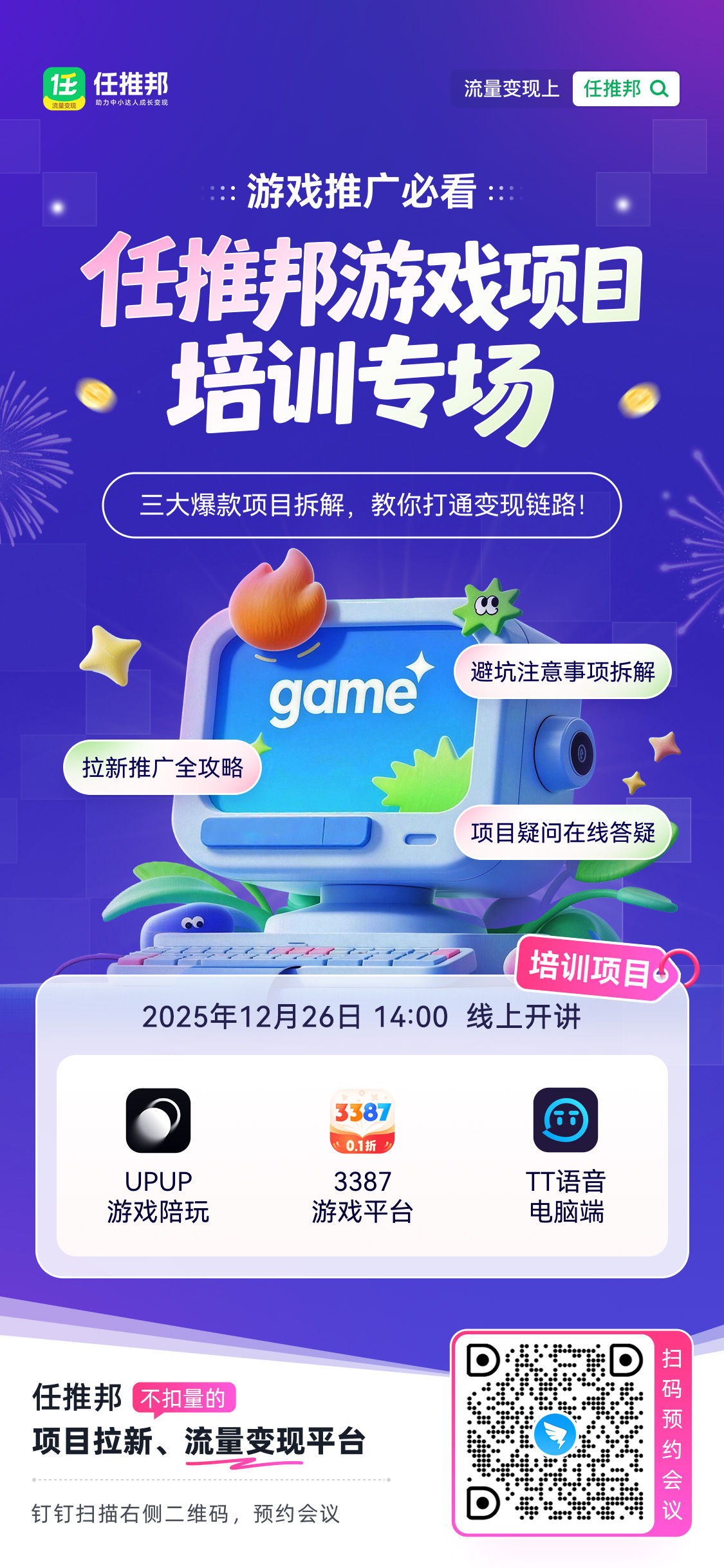 任推邦-游戏推广必看!任推邦游戏项目培训专场(扫描下方二维码报名)